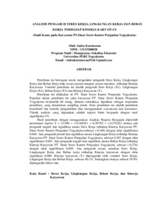 (studi kasus pada toyota nasmoco surakarta). Pengaruh stres kerja terhadap kinerja karyawan. Studi menunjukkan bahwa perusahaan dan kantor yang bergelut di bidang hukum, pertanian, kesehatan, dan angkatan bersenjata, merupakan industri . Metode analisis data yang digunakan adalah metode deskriptif kuantitatif yang telah diperoleh melalui data langsung dari perusahaan. Sudah menjadi hal umum apabila dalam suatu organisasi, banyak pegawai yang secara potensi .